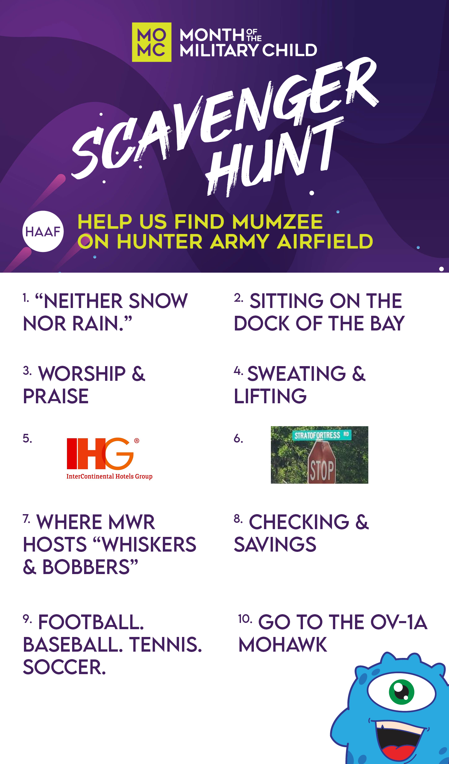 To become eligible to win, find Mumzee at the 10 locations on Fort Stewart or Hunter Army Airfield starting now and ending on 8 May! Here's how: