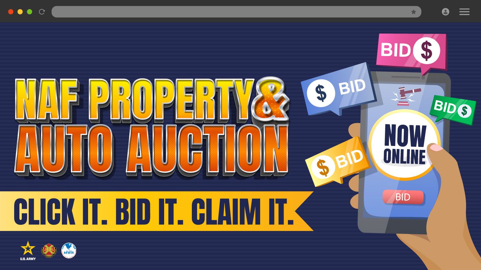 You don't have to wait for our next annual event! Now you can bid online for NAF excessive property items such as fitness equipment, furniture, lawn care equipment, electronics, unclaimed vehicles and more!